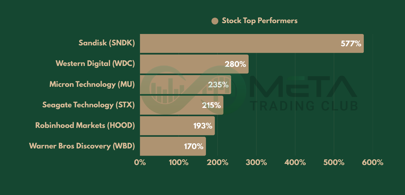 SanDisk led the market with explosive gains fueled by surging demand for high‑capacity memory and a powerful rebound in pricing, while Western Digital and Seagate also benefited from the AI‑driven expansion of data‑center infrastructure. Micron joined the outperformers as DRAM and NAND markets tightened and AI server shipments accelerated.