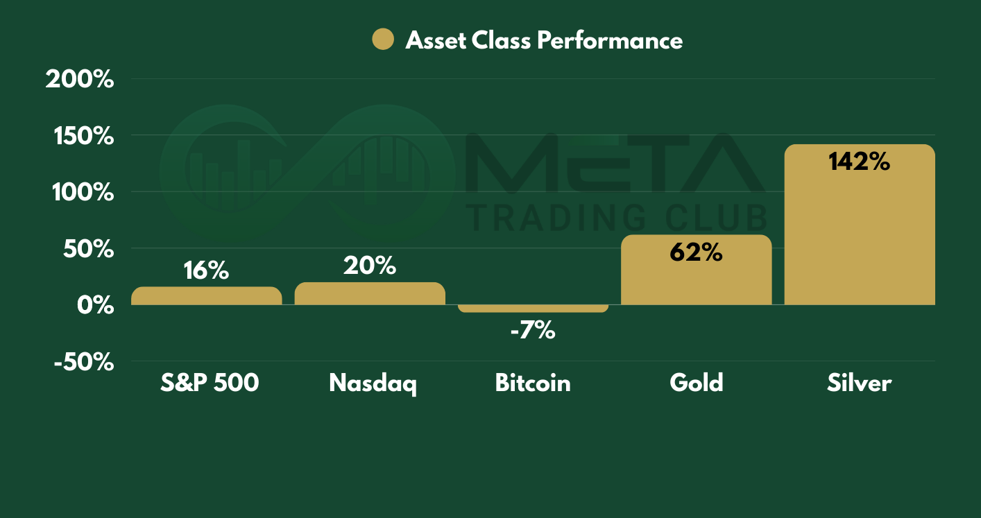 - Gold: Gold prices surged 62%, driven by heightened geopolitical uncertainty, central‑bank buying, and investor demand for safe‑haven assets amid currency volatility.