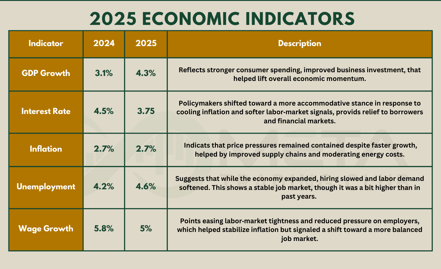 - Interest rates eased from 4.5% to 3.75%, as policymakers shifted toward a more accommodative stance in response to cooling inflation and softer labor‑market signals, providing relief to borrowers and financial markets.
