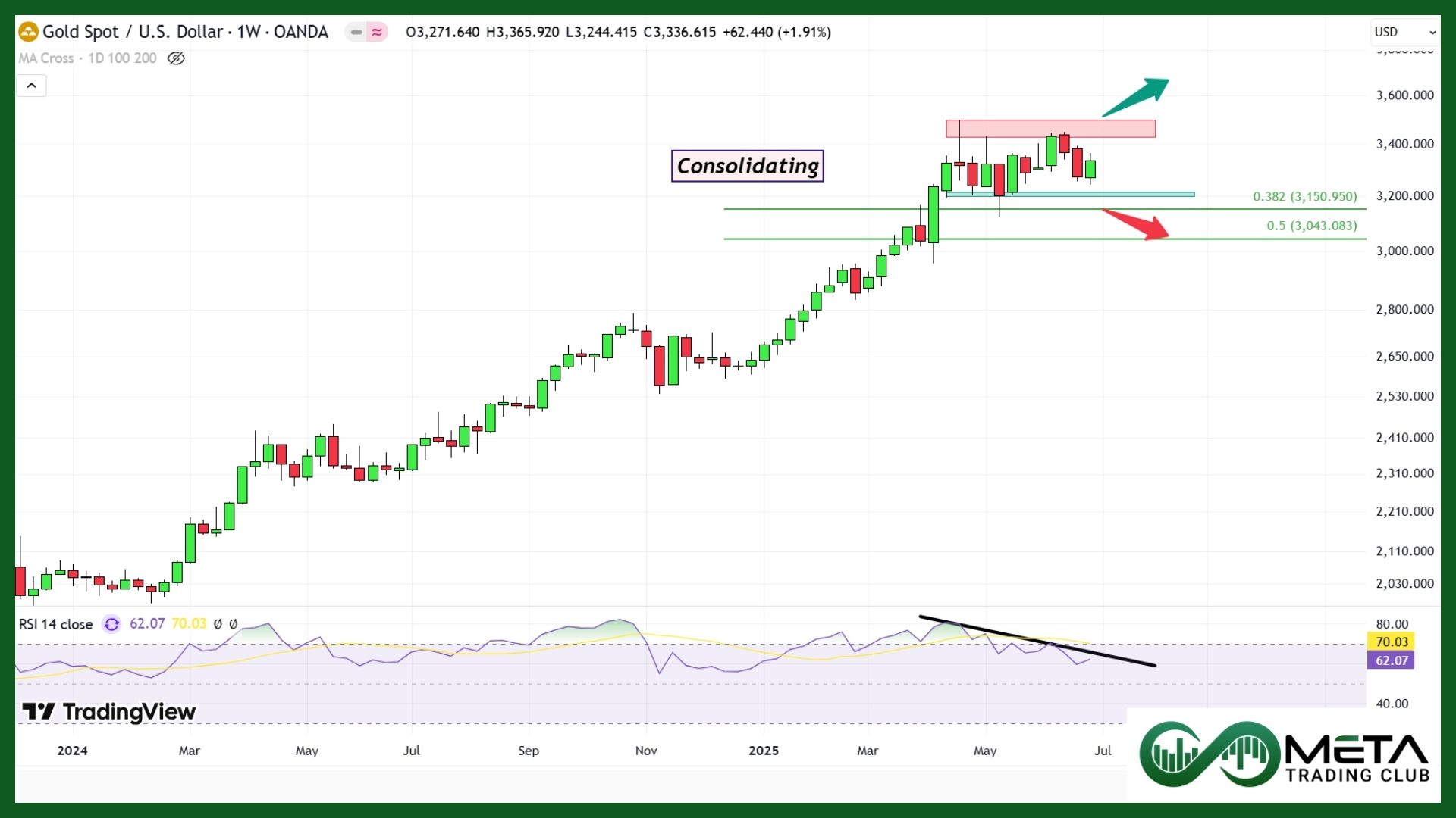 Technically, on the weekly chart, SPX is showing a clear upward trend with solid momentum. If this strength continues, especially with help from improving trade conditions, the index could rally further, potentially reaching the 6,500 Fibonacci resistance zone.