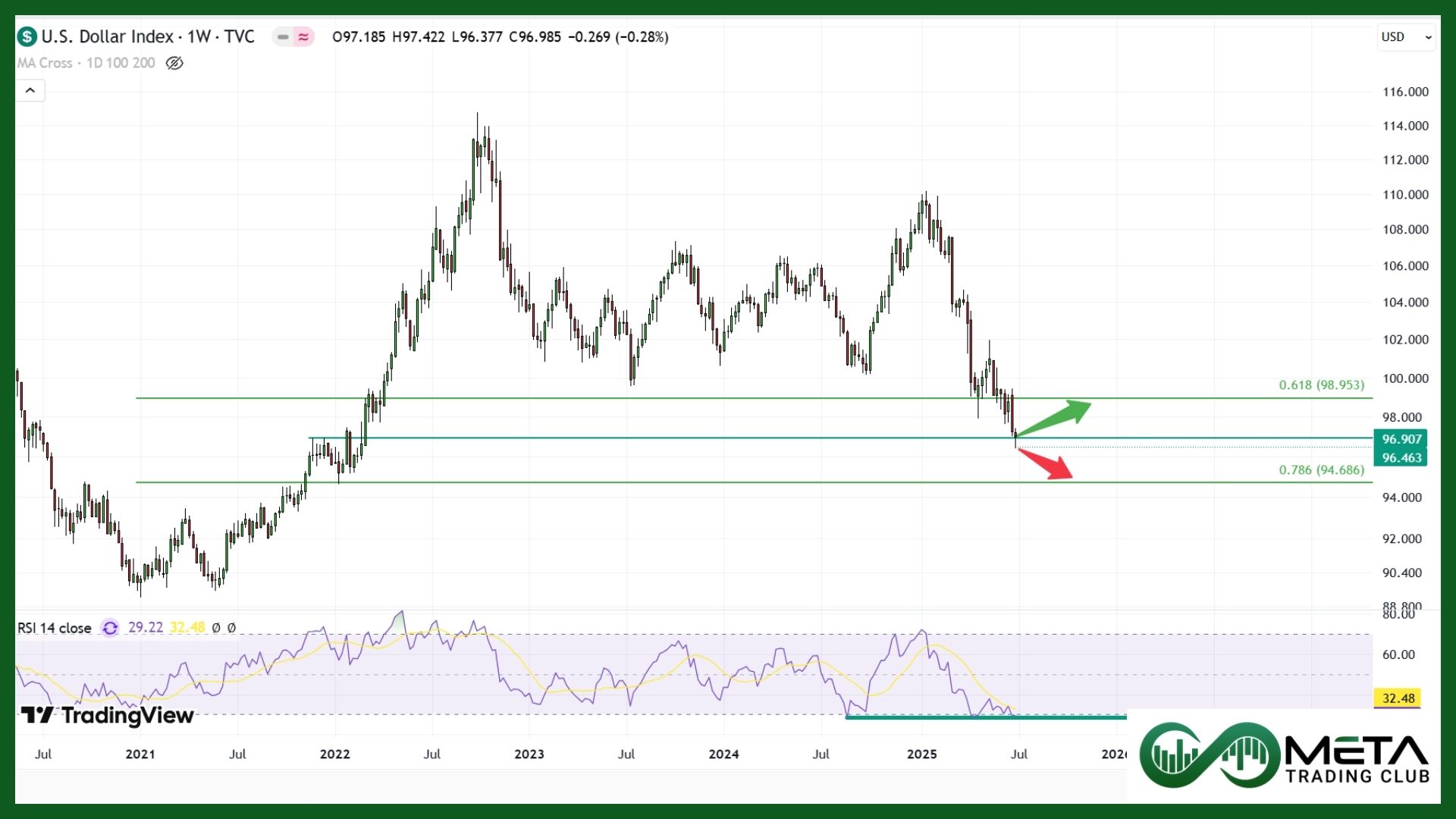 Technically, DXY has reached oversold territory on the weekly RSI as it tests the $97 support zone. Given the oversold conditions, a potential rebound from this level is possible. However, if the index breaks below last week’s low, further downside toward lower support levels could follow.