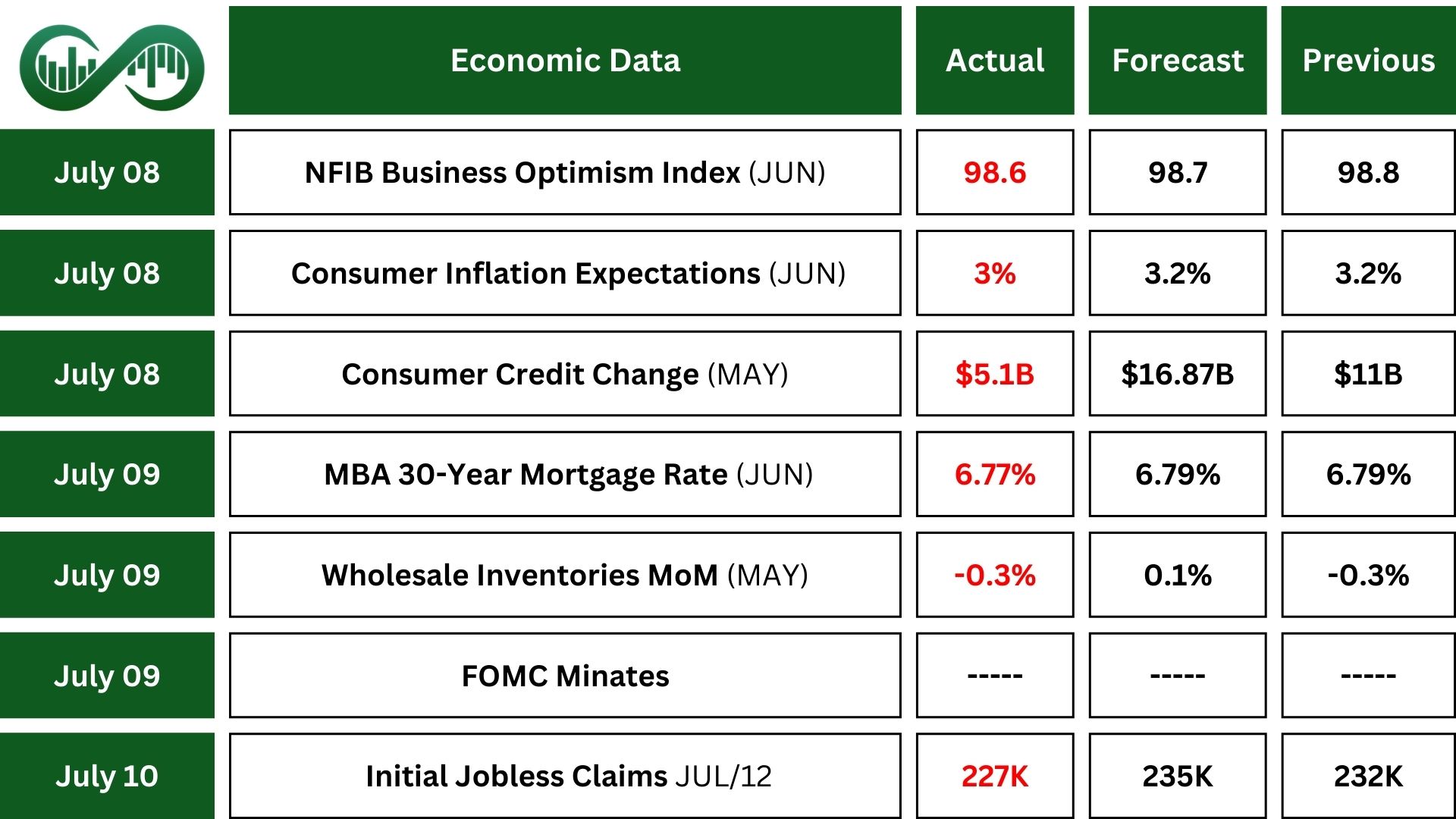 U.S. Initial Jobless Claims dropped in early July to 227,000, marking the fourth straight weekly decline and the lowest level in seven weeks, suggesting the labor market is still holding up despite high rates and uncertainty. However, total unemployment claims rose to their highest since 2021, hinting that hiring may be slowing.