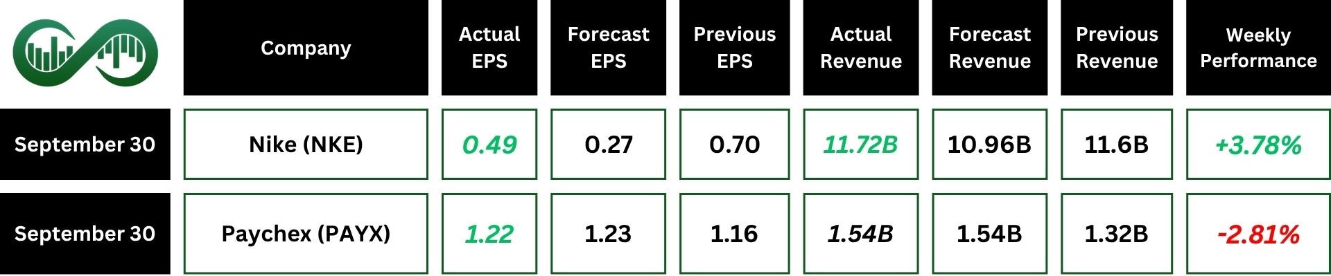 Nike (NKE) posted adjusted EPS of $0.49, beating expectations despite a 30% year-over-year drop. Revenue rose 1% to $11.7B, topping forecasts, though currency-neutral sales declined slightly.