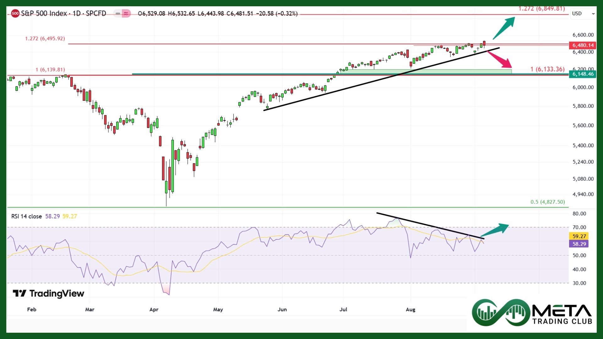 Technically, if SPX keeps losing RSI momentum and breaks its short-term uptrend line, it could drop further. But if the RSI downtrend breaks and the index clears the strong resistance near 6500, a sharp rally may follow.