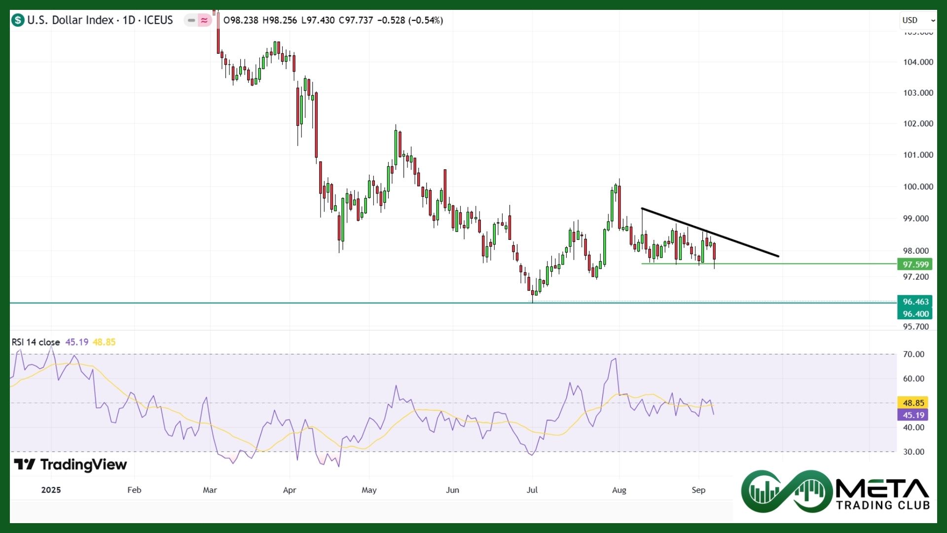 The U.S. Dollar Index (DXY) dropped 0.7% to a 1.5-month low last week, pressured by signs of a weakening labor market and growing expectations for Federal Reserve rate cuts before year-end. The disappointing jobs report reinforced views that the Fed may need to ease policy sooner, reducing the appeal of the dollar.